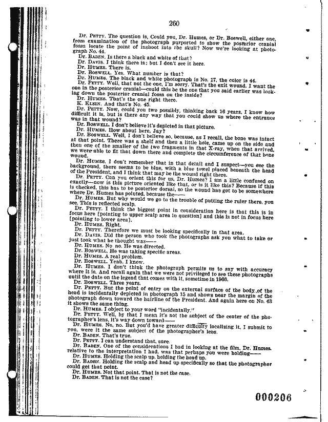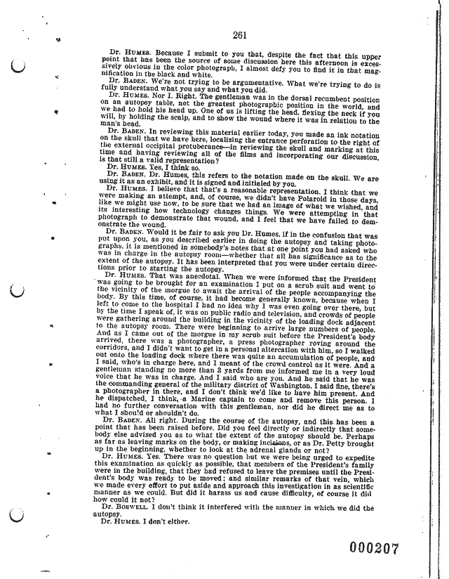 TESTIMONY OF LYNDAL L SHANEYFELT RESUMED (Present were Mr. McCloy, Mr. Dulles, and Representative Ford.) Mr. SPECTER. May the record now show that the Commission has now reassembled on the first floor of the VFW Building where a motion picture projector and slide projector and screen have been set up for viewing of the films. Mr. Shaneyfelt, what are you going to show us first of all? Mr. SHANEYFELT. The first film will be of the color motion picture made through the rifle scope as the car drove down the assassination route at approximately 11 miles an hour. It wi11 give the view the rifleman had as he aimed the rifle from the sixth floor window of the Book Building. (Film) Mr. DULLES. Is that going 11 miles per hour? (Discussion off the record.) Mr. SHANEYFELT. This film will be the black and white photographs of the car in the fixed still positions in each of the frame numbers described in previous testimony. In addition the final portion of the film is a run through of the car at 11 miles an hour on three separate runs filmed as the rifleman would have seen the car looking through the rifle. On the first run of the car going down the assassination route I have stained frames in the vicinity of frame 222 which is after the first clear shot after the tree, I have stained the frame at the location of shot 313, which is the second pink flash you will see. I found, in examining the film, that this is a shorter span of time than in the actual film. It is a span on the reenactment of about three and a half seconds between 222 and 313. The second frame stained is 313 but since it is running at a faster speed I have also stained a spot that represents 5 seconds which is what the time lapse was between frame 222 and frame 313 in the actual assassination films. That will be after the car driving scene. (Film) Mr. SHANEYFELT. This is the last clear shot and this is an adjusted last clear shot before going under the tree. This is the shot approximately 185. This is frame 186 which is the adjusted shots which would account for a 10-inch variance. Shot of frame 207, and the adjusted frame which was 210. This is frame 222 and you can see the tree is still in the background. This is 225 now. 231. At this point Governor Connally states he has been hit by now. This is 235. 240--249--255--and the shot to the head which is 313. Mr. SPECTER. What is this? Describe this, Mr. Shaneyfelt. Mr. SHANEYFELT. This is the run at 11 miles an hour containing the pink stain. This is another run at 11 miles an hour. It will give you some idea 176 Page 177 of the difficulty of tracking a car with a heavy camera mounted on the rifle. Mr. McCLOY. You have to sight that with a camera? Mr. SHANEYFELT. Sighting through a camera. (Film) Mr. REDLICH. Just as a final thing, Mr. McCloy, would you like to see the Zapruder film? Mr. McCLOY. I think we will take the original Zapruder again, I don't know whether we have anything that is more significant in the black and whites, I am talking about the particular movies of the frames, we have not seen those. Mr. SHANEYFELT. Yes. Mr. McCLOY. I think we have seen all we need to see with regard to that. What have you got left? Mr. SHANEYFELT. The original Zapruder film. Mr. McCLOY. We will see that. Mr. SHANEYFELT. We have the duplication of the Zapruder film reenactment. The first portion of the reel is the still shots and the last portion is the run through at 11 miles an hour. Mr. SPECTER. I think you would find that worth while to see. Mr. SHANEYFELT. Then we have Nix and Muchmore of the same run. Mr. McCLOY. Let's do those, too. Representative FORD. First is the original Zapruder. Mr. SHANEYFELT. Original Zapruder. This is not the original. This is the first copy. (Film) Mr. SPECTER. Will you state for the record what film we just saw? Mr. SHANEYFELT. This film we just viewed is a copy made directly from the original Zapruder film of the actual assassination. Mr. SPECTER. Could you now show us the film which was taken at the reconstruction from the Zapruder position? (Film) Mr. SHANEYFELT. These films we made in Dallas have been developed and left intact and have not been edited in any way so there are a lot of blank spaces where we run the leader off and turn the film. This is position 161. This side-to-side jiggle is a camera malfunction. Mr. McCLOY. This is 16 mm.? Mr. SHANEYFELT. No; 8 mm. Representative FORD. Is this from his camera? Mr. SHANEYFELT. Yes; taken with his camera. Frame 222, frame 225. This is frame 231. Representative FORD. He has a delayed reaction compared to what the President did. Mr. SPECTER. What frame is this, Mr. Shaneyfelt? Mr. SHANEYFELT. 313, the head shot. Mr. McCLOY. The head shot. Mr. SHANEYFELT. This is the position which is not duplicated on the Zapruder film. This is running the film out to reload it. During that run at 11 miles an hour we made no effort to duplicate the body position because it would have been most difficult to know just when to turn. The only other films we have are the ones we shot with the Nix and Muchmore cameras of this same run from their positions. Mr. McCLOY. Did Nix, Muchmore get a second shot of the head shot? Mr. SHANEYFELT. Mrs. Muchmore got the head shot and Mr. Nix got the head shot. Mr. McCLOY. They both got it. Mr. SHANEYFELT. We have both those films. Mr. McCLOY. We might take a look at it while we are here. I don't think I have ever seen those. Those are 88 mm, too. Mr. SHANEYFELT. Yes. (Film.) Mr. SHANEYFELT. This film is the film that was taken by Mr. Orville Nix of the assassination. This is along Houston street going toward Elm. There 177 Page 178 was the head shot. We will roll it back and run it at slow motion. The head shot shows just a very faint pink. Mr. McCLOY. Very soon after this sequence begins. Just as the President is directly under the white abutment in the background. I will try to give you a clue about when it is going to happen, there. The next film is the film that was exposed in Mr. Nix's c